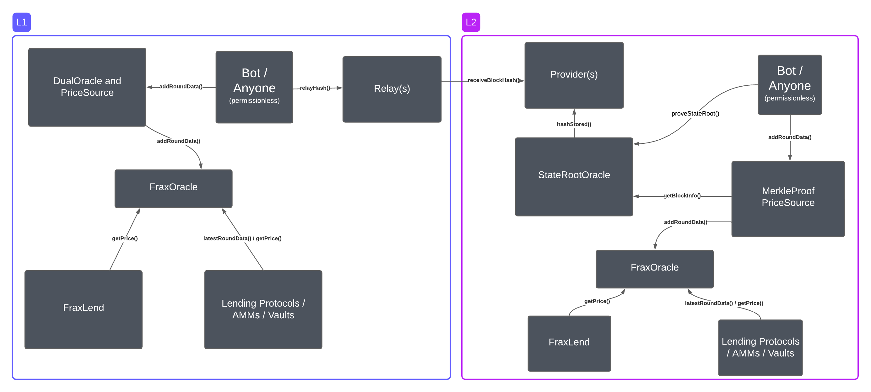 <figure><img src="https://1160856619-files.gitbook.io/~/files/v0/b/gitbook-x-prod.appspot.com/o/spaces%2F-MJQZW1mSg2O5N7HXHo0-1972196547%2Fuploads%2FOupo5gALMP6sjibVPBZ2%2FL2%20-%20frxEth_ETH%20and%20sfrxEth_Eth%20Frax%20Oracles%20(5).png?alt=media&#x26;token=662d22f7-8061-469c-8fed-abba2e1dc09a" alt=""><figcaption><p>L1 -> L2</p></figcaption></figure>