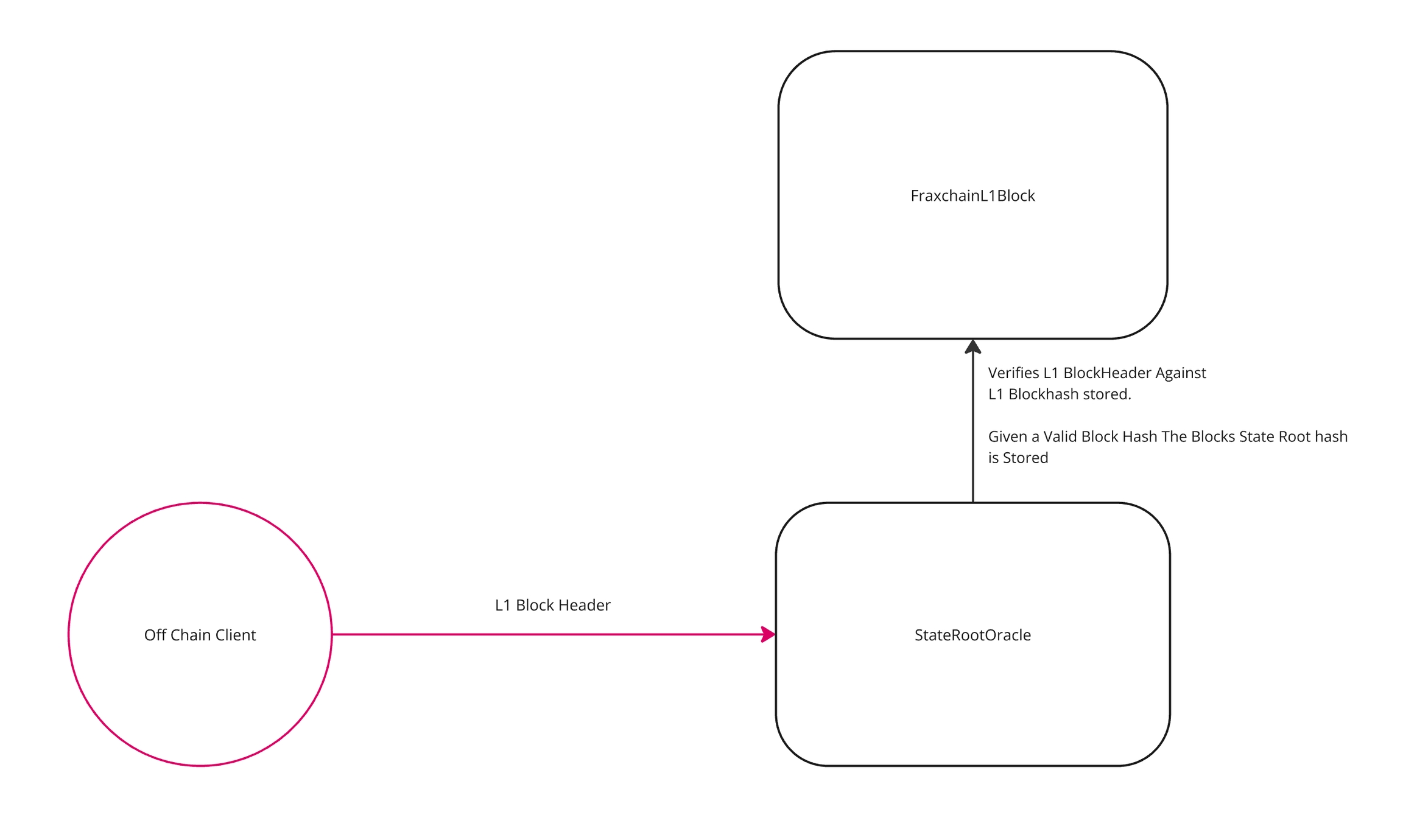 合约用于验证给定的区块头与通过 FraxchainL1Block 合约中继的 L1 区块哈希。该合约负责存储状态根哈希以及 L1 时间戳。